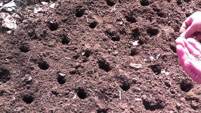 Перед посевом не нужно глубоко перекапывать землю. Достаточно слегка ее рыхлить, затем нарезать бороздки и высевать семена.