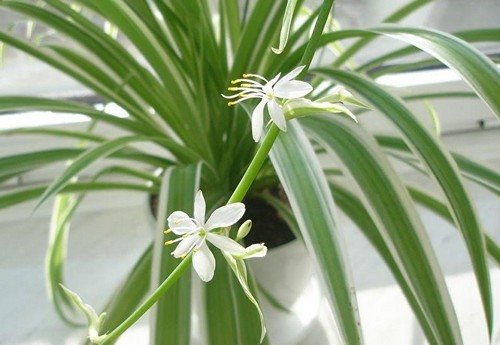 | Хлорофитум | Легко переносит засуху и переувлажнение, очищает воздух, любит яркий рассеянный свет | Мелкие белые цветы на длинных цветоносах |