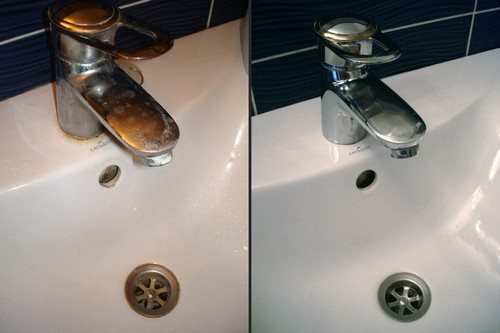 На хромированных элементах сантехники часто остаются следы высохшей воды. Если взять ватный диск, смочить его уксусом и протереть кран, вы будете приятно удивлены результатом.