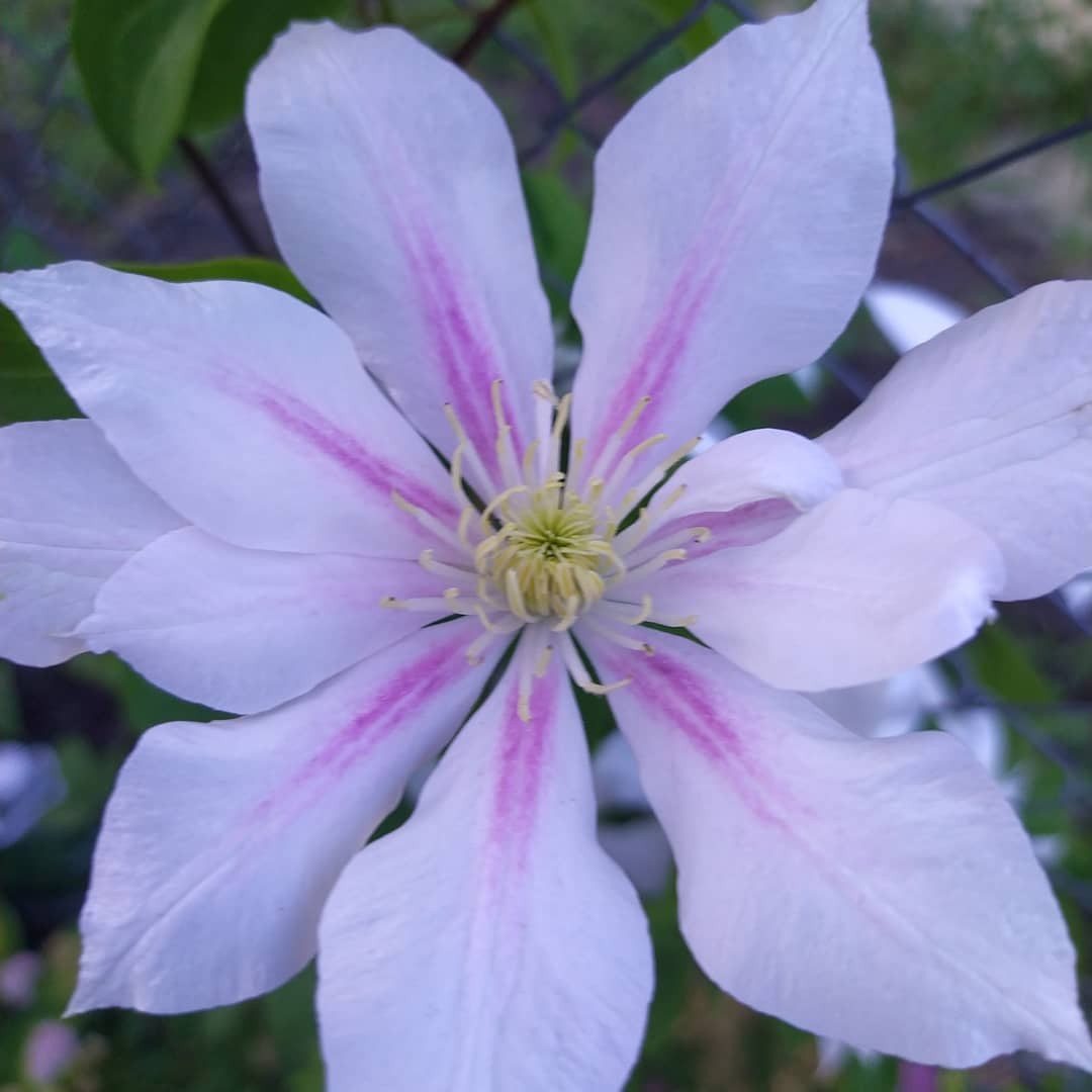 Позднецветущий кустарник из группы Витицелла достигает высоты до 3 метров. Период цветения начинается в конце июня. Белоснежные лепестки с фиолетовыми краями и прожилками появляются на новых побегах и радуют глаз до сентября. Размер бутонов не превышает 8 сантиметров в диаметре.