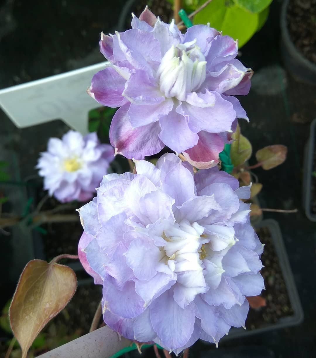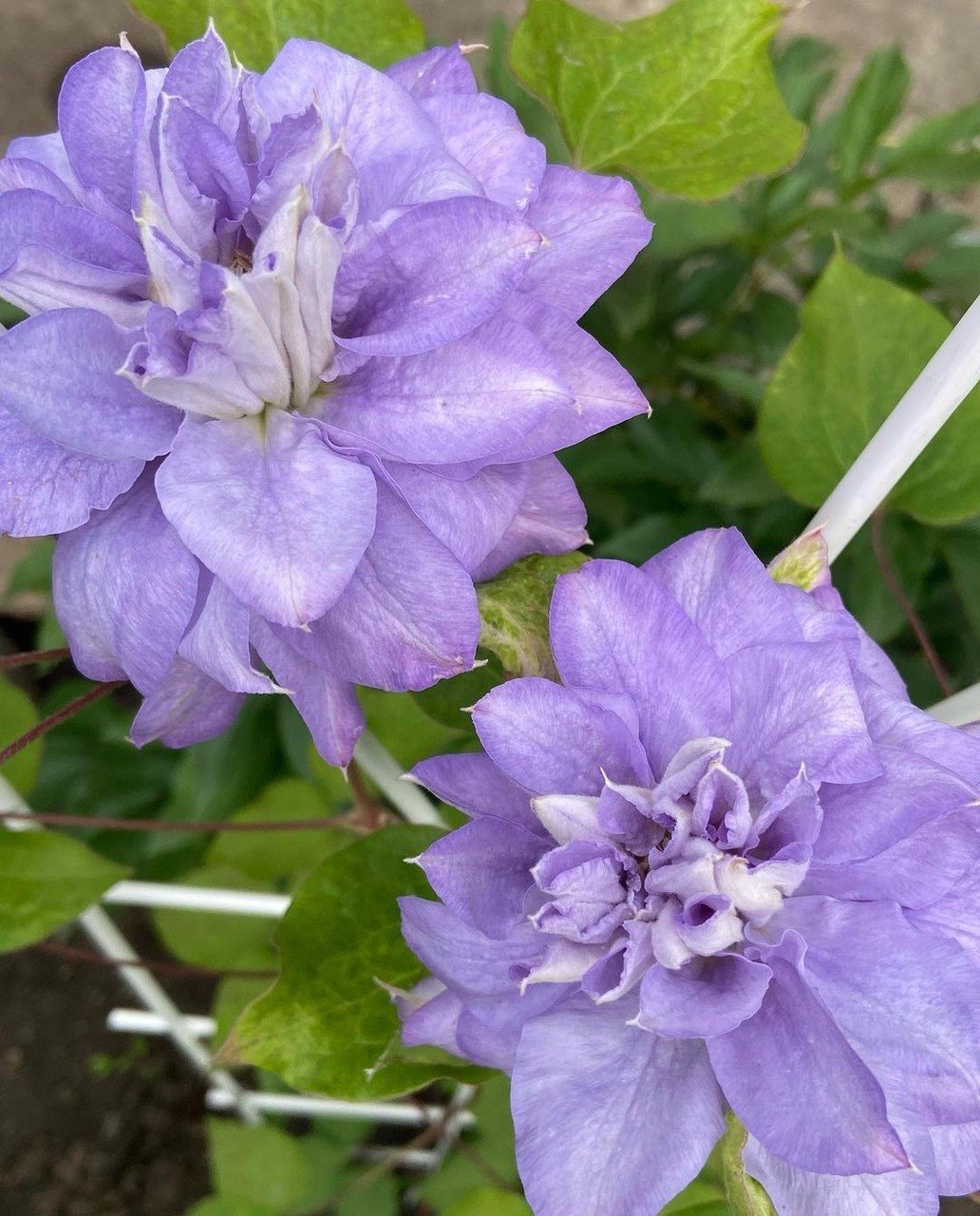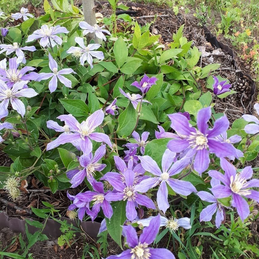 Цветение вьющегося растения происходит дважды в течение сезона: с мая по июнь и с июля по октябрь. Цветочные бутоны формируются на побегах, которые появились в прошлом году. Махровые цветы лилового оттенка достигают 15 см в диаметре и имеют округлую форму.