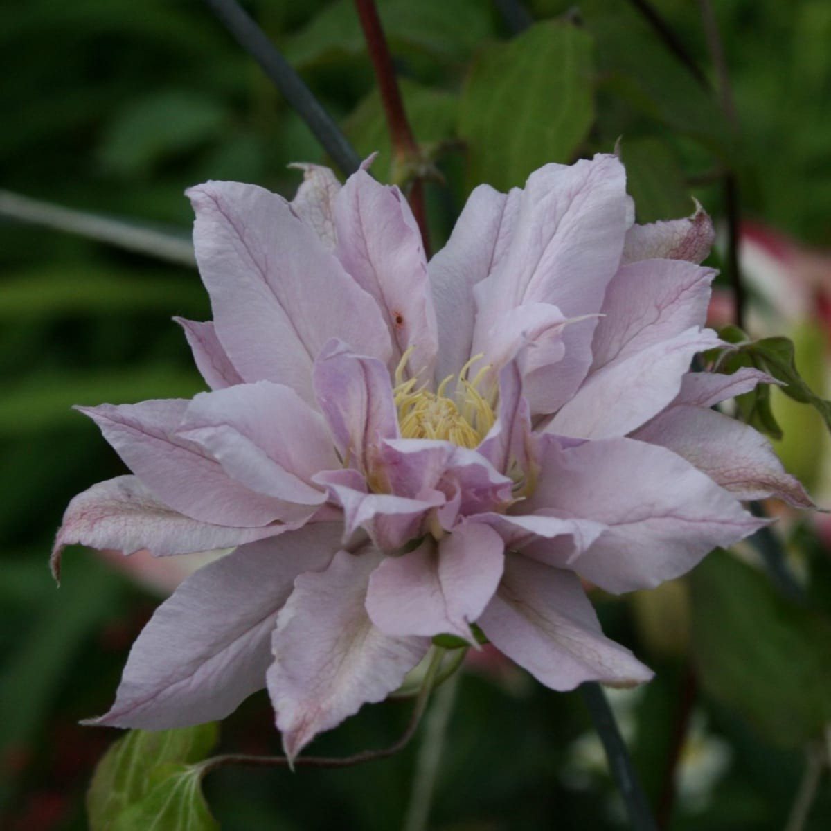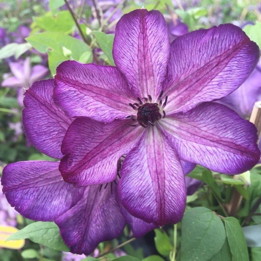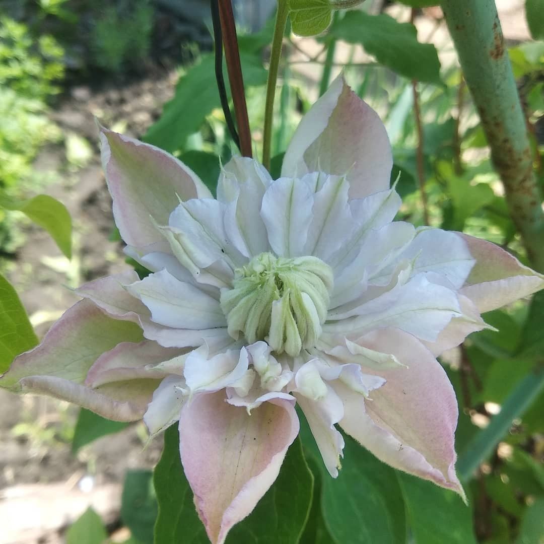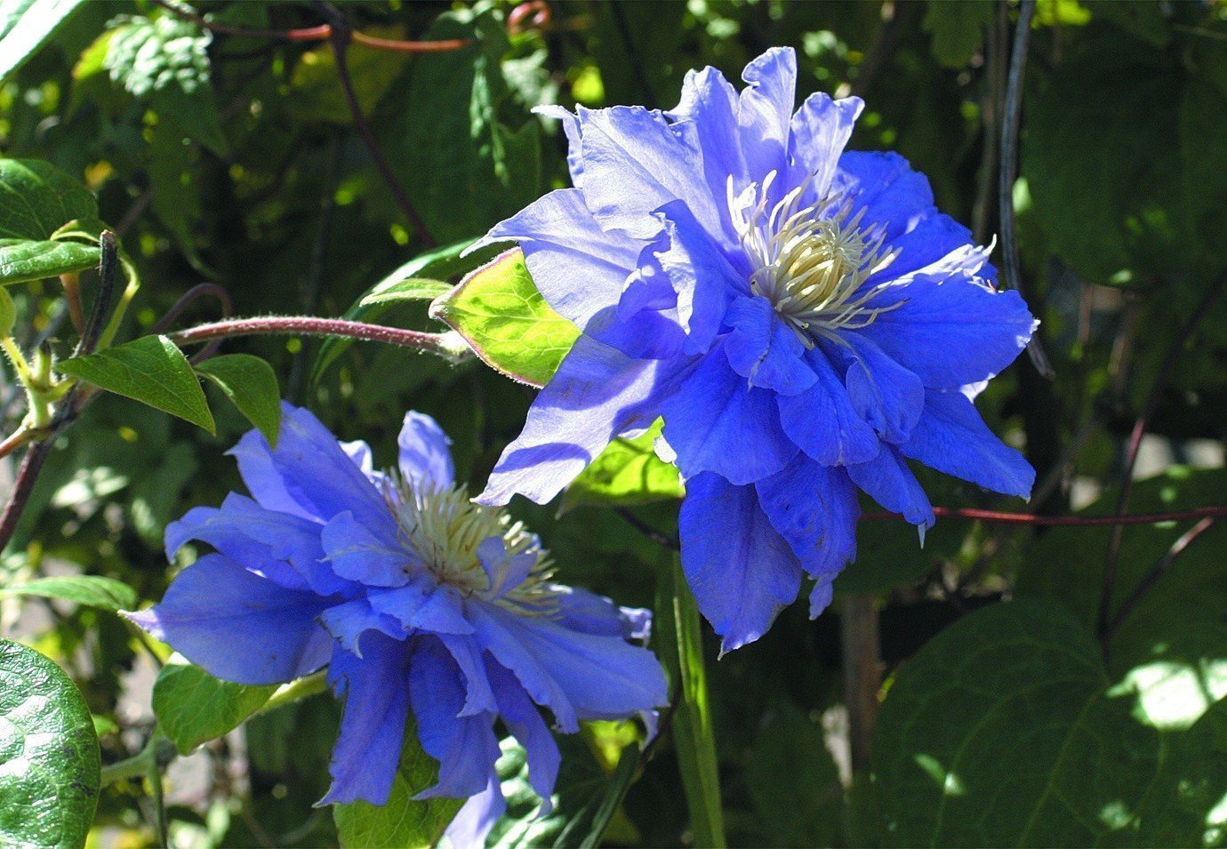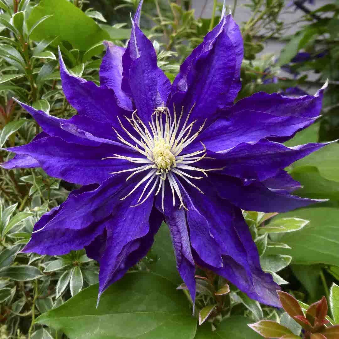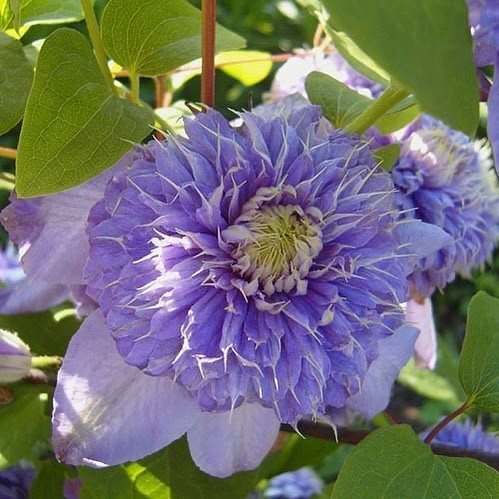 На протяжении сезона гибкие зеленые лианы приобретают коричневый оттенок. На них распускаются махровые цветы сине-фиолетового цвета, диаметром до 20 см. Чашелистики располагаются в два ряда. Верхние лепестки имеют овальную форму с острым концом, а нижние — покрыты волосками. Их количество варьируется от 6 до 8.