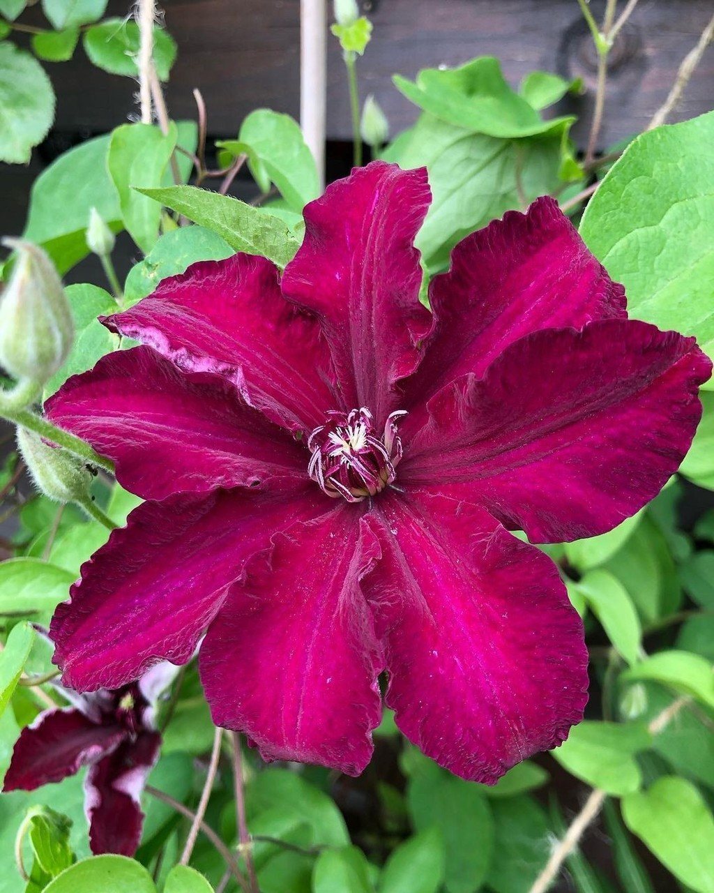 Кустарниковая лиана относится к группе Жакмана и может достигать высоты до 3 метров. В июне и июле распускаются крупные чашелистики, окрашенные в бардовые или пурпурные оттенки, размером около 15 см, с овальными лепестками. Листья имеют тройчатую, перистую форму и средние размеры, а их поверхность обладает глянцевым блеском.