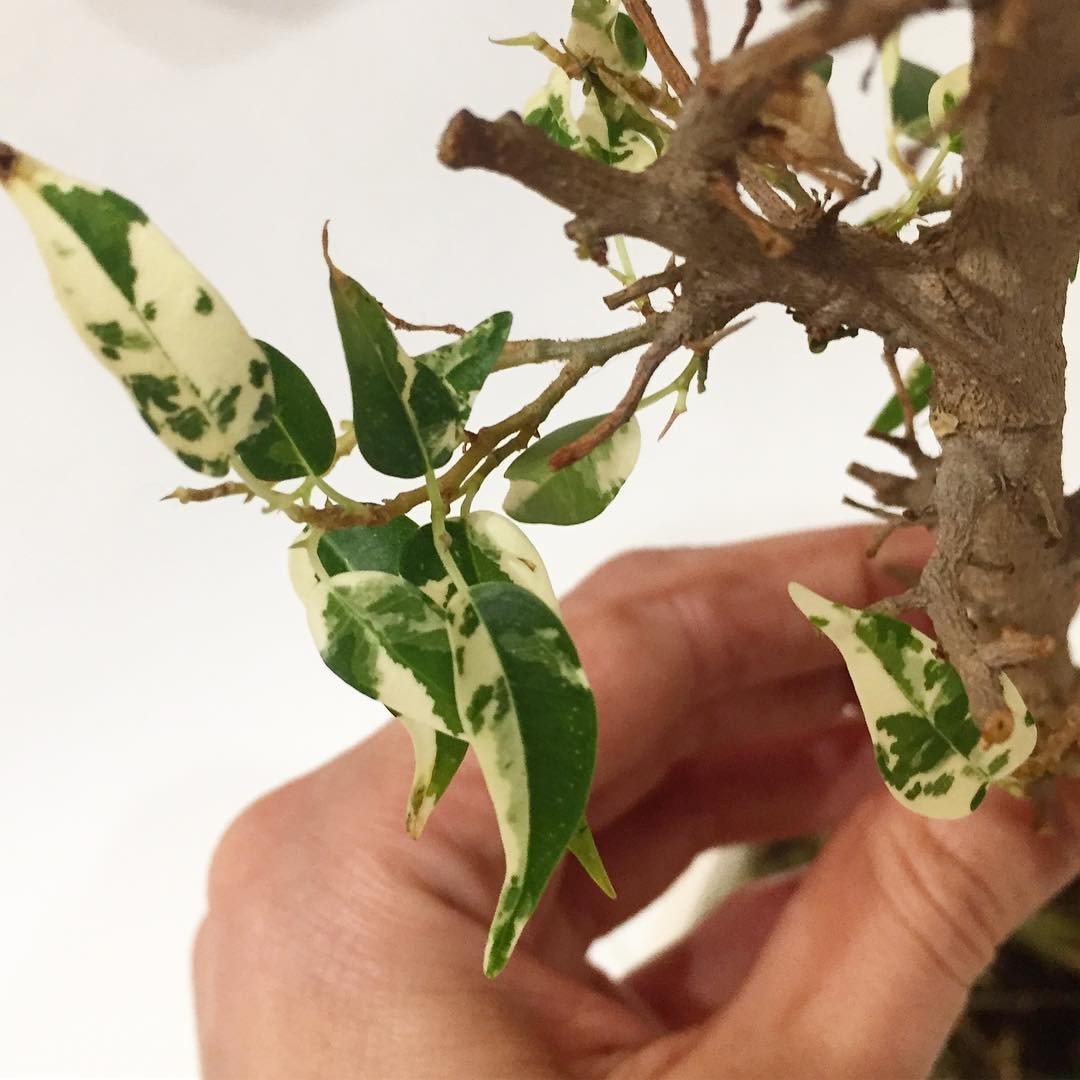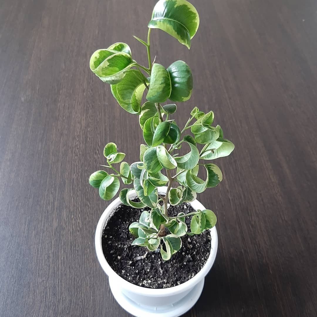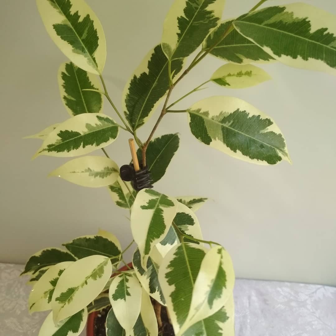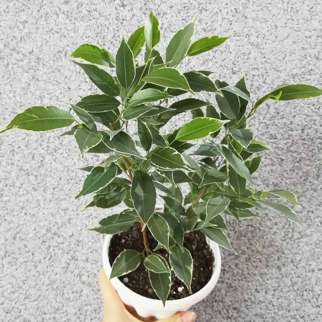 Этот компактный сорт идеально подходит для небольших квартир. Крона растения легко поддается обрезке, что позволяет формировать ее в любую желаемую форму. Даже начинающий садовод сможет справиться с формированием верхушки. Листья узкие, достигают 7 см в длину, имеют насыщенный темно-зеленый цвет с белой или кремовой окантовкой. Для того чтобы фикус рос активно, температура в помещении должна быть не ниже 20 градусов Цельсия. Важно защищать растение от сквозняков, особенно в зимний период, так как они могут негативно сказаться на его здоровье. Полив следует сочетать с регулярным опрыскиванием из пульверизатора. Хотя растение не цветет, на нем могут появляться ягоды.