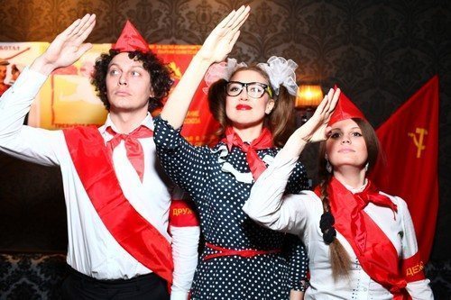 В качестве костюмов подойдут пионерские галстуки и пилотки, клетчатые рубашки, скромные платья или школьная форма тех лет. Детей можно нарядить в карнавальные костюмы волка, зайца или снежинки.