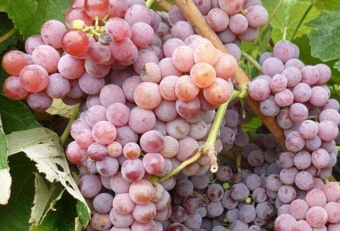 Кусты данного сорта отличаются высокой ростом и требуют подвязки к шпалере. Ягоды формируются в крупные и плотные грозди, вес которых составляет от 250 до 300 граммов. Виноградины небольшие (не превышают 1,5 грамма), и по мере созревания они приобретают розоватый оттенок и нежный аромат. Мякоть практически без косточек, обладает мягкой текстурой и сочностью, а кожура легко пережевывается. Полноценный урожай можно ожидать на четвертый год после посадки. Этот сорт считается суперранним, и в Подмосковье его плоды созревают в начале сентября. С одного куста можно собрать от 8 до 10 килограммов винограда.