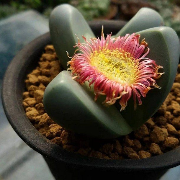 | Литопс (Lithops) | Очень яркий свет, минимальный полив (только когда «морщится»), специальный минеральный грунт. | Изображение Литопса |
