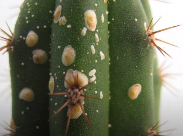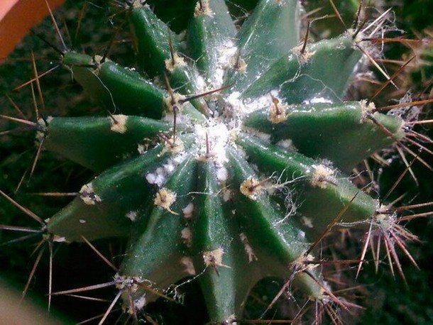 Наиболее распространенный вредитель суккулентов — мучнистый червец. Этот паразит питается соком побегов, листьев и цветочных бутонов, а при значительном размножении образует заметные ватные комки.