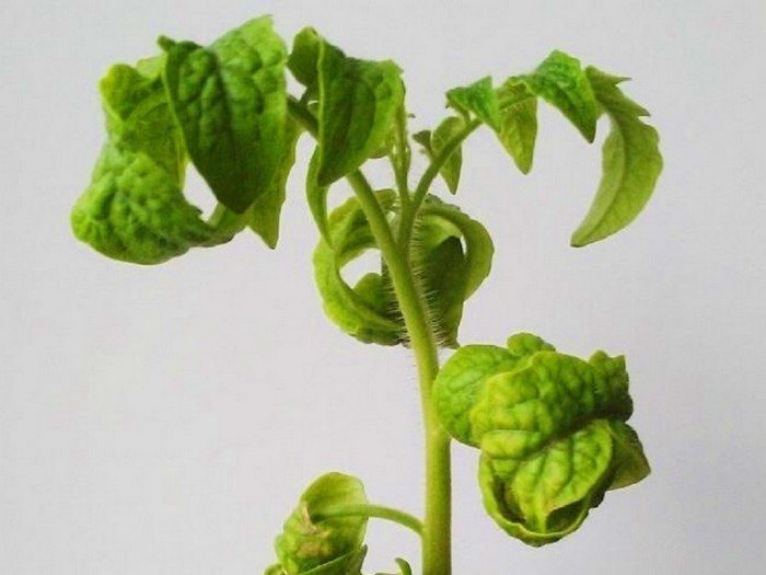 При переизбытке калия задерживается поступление большинства других элементов в растение, что приводит к задержке роста растений. Междоузлия удлиняются, листья светлеют. Нижние листья закручиваются, появляются пятна. Новые листья тонкие, с хлорозом между прожилок.