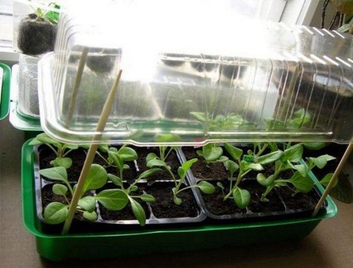 Петуния обладает высокой чувствительностью к уровню влажности в воздухе. В начале роста сеянцы рекомендуется держать под защитным укрытием из стекла или пленки. Также удобно использовать пластиковые контейнеры с прозрачной крышкой для выращивания рассады. Каждый день укрытие следует ненадолго приоткрывать для проветривания мини-теплички. Если этого не делать, на поверхности почвы может образоваться плесень.