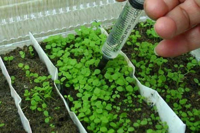 Наиболее удобно поливать растения с помощью медицинского шприца без иглы или пипетки. Когда сеянцы подрастут, можно использовать небольшую леечку с узким носиком. Важно, чтобы вода не попадала на стебли рассады во время полива. Для защиты сеянцев от «черной ножки» рекомендуется посыпать верхний слой почвы тонким слоем крупнозернистого песка.