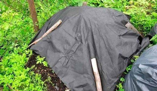 После укладки последнего слоя компоста его необходимо присыпать слоем грунта толщиной 5 см. Сверху накрывается черной пленкой.