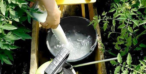 - Добавьте 10 литров воды, чтобы разбавить сыворотку. Это поможет избежать перегрузки растений питательными веществами.