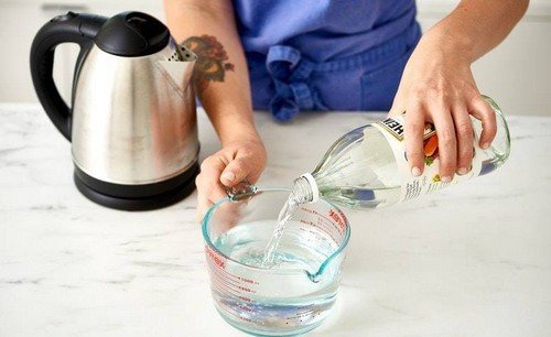 - Подогрейте 130 мл 9%-ного уксуса до температуры 40–50 ℃.