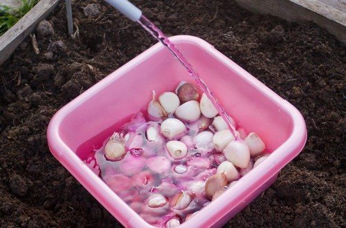 | Замачивание в растворе марганцовки | Обеззараживание, профилактика грибковых заболеваний | Развести марганцовку до бледно-розового цвета (1 г на 10 л воды). Замочить зубчики на 20-30 минут. |