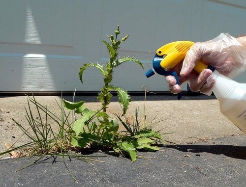 Для приготовления раствора необходимо надеть резиновые перчатки для защиты рук. На 1 литр воды добавляем 10 мл зеленки и 1 столовую ложку 6% уксуса. Тщательно перемешиваем. Обрабатываем сорняки, стараясь избежать попадания капель на овощные и ягодные растения. При необходимости повторяем процедуру в течение всего лета.