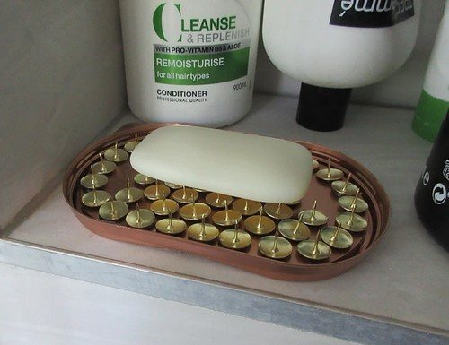 Мыльницу такой конструкции можно легко приобрести или сделать самостоятельно, что займет всего пару часов. Как насчет идеи с использованием канцелярских кнопок и крышки от пластикового контейнера? Это недорого и очень стильно. Крышка окрашена аэрозольной краской, а кнопки надежно прикреплены с помощью клеевого пистолета.