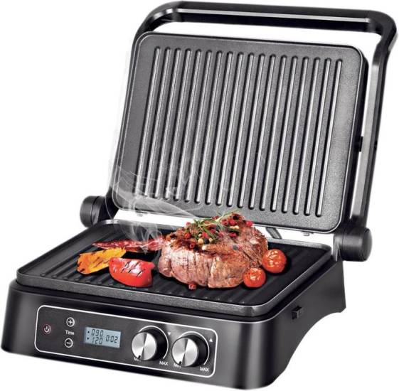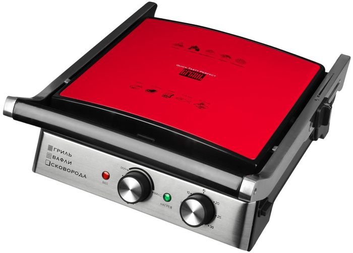 Съемные панели имеют антипригарное покрытие, что исключает риск пригорания и прилипания пищи. Устройство оснащено таймером автоматического отключения и дисплеем с подсветкой.