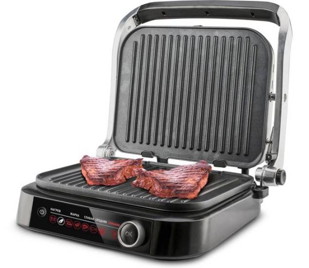 Крышка устройства открывается на 180 градусов, что обеспечивает удобство в использовании. Каждая панель имеет возможность индивидуальной настройки температуры, что является большим плюсом. Верхняя пластина может регулироваться по высоте в четырех положениях.