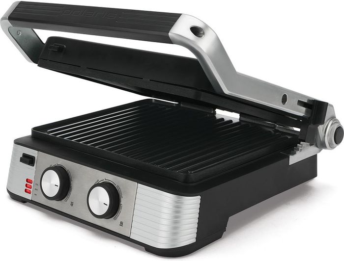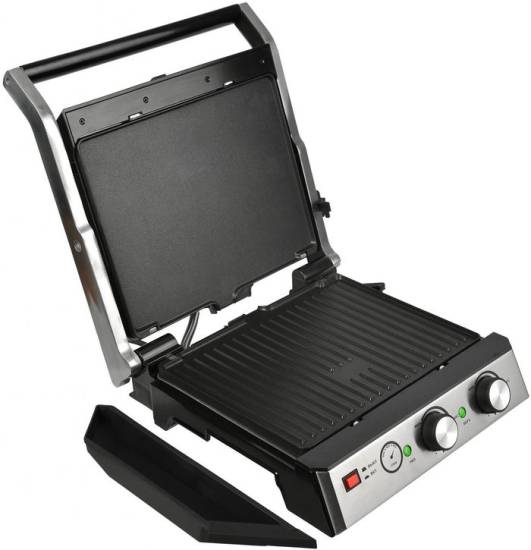 Мощность данного электрогриля составляет 1800 Вт. Крышка модели открывается на 180 градусов, что позволяет удобно готовить на двух поверхностях одновременно.