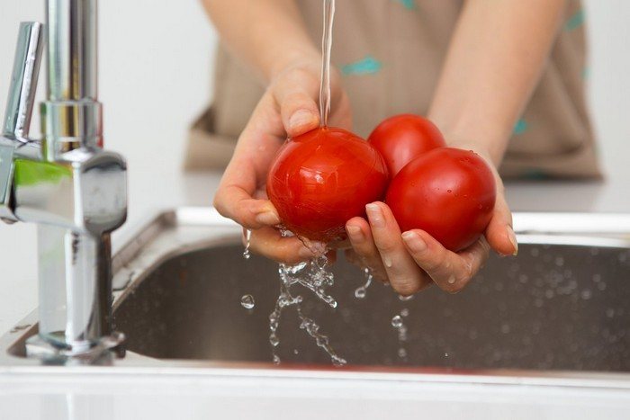 Помимо томатов, в банку часто добавляют кусочки острого перца, чеснок и зелень. Перед началом приготовления все ингредиенты следует тщательно промыть. Даже небольшая частица грязи на овощах или зелени может привести к порче консервов. Рекомендуется мыть помидоры не в дуршлаге, а в большой кастрюле или тазу, при этом меняя воду несколько раз. На завершающем этапе ингредиенты следует промыть под проточной водой.