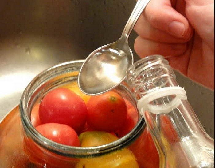 Благодаря уксусной кислоте, маринованные и консервированные помидоры могут храниться долгое время. Уксус добавляют в самом конце, непосредственно в банку, так как часть его может испариться во время кипячения. Для банки объемом 1 литр рекомендуется использовать 60 мл 9%-ного уксуса или 0,5 чайной ложки уксусной эссенции с крепостью 70%.