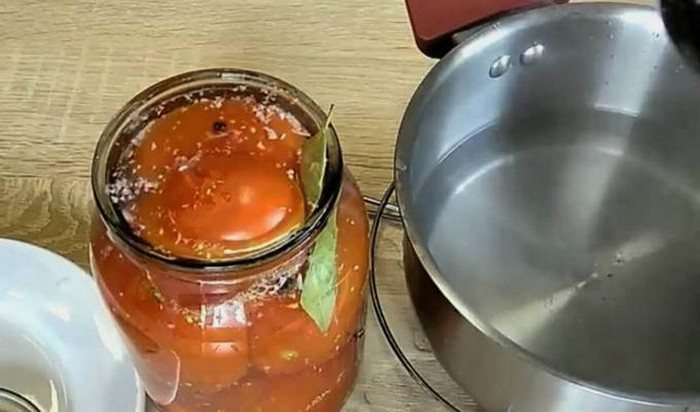 Помидоры на зиму консервируют в стеклянных банках, закрывая их жестяными крышками. Обязательно следует провести стерилизацию тары, и не имеет значения, каким способом это будет сделано. Стерилизацию можно осуществлять в микроволновой печи, духовом шкафу или на водяной бане.