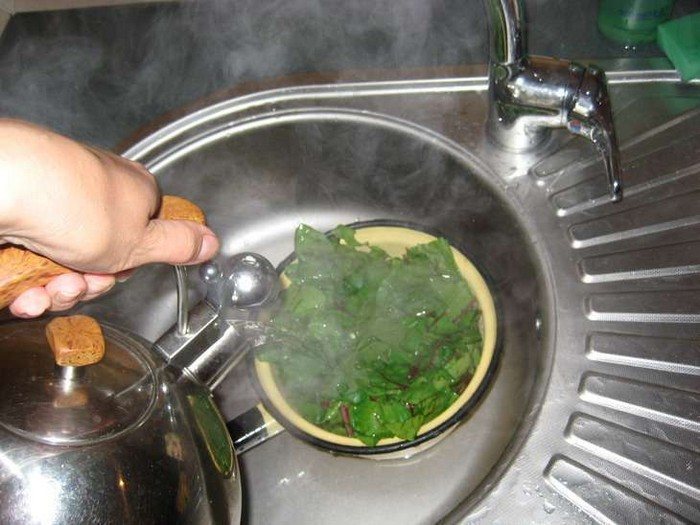 Удобнее всего это делать, поместив листья и травы в дуршлаг, чтобы избежать ожогов. Ошпаривание выполняет функцию стерилизации. В противном случае на зелени могут оставаться бактерии, которые позже начнут размножаться в банке, что приведет к порче заготовки.