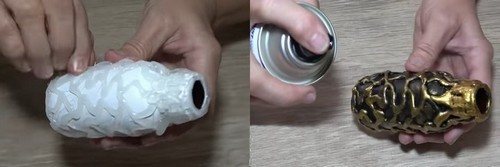 Чтобы украсить емкость, сначала ее поверхность обрабатывают грунтовкой, а затем наносят декоративный слой. В качестве элементов декора можно использовать бусины, красивые семена, бисер, яркие акриловые краски, горячий клей, яичную скорлупу, ленты, кружева и другие мелкие предметы, которые могут оказаться под рукой.