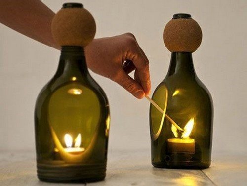 Целые бутылки или их碎片 могут стать основой для витражей или элементов декора. Их можно зафиксировать в цементной смеси или соединить с помощью горячего клея.