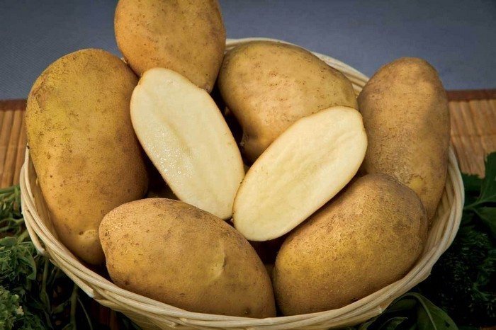 Клубни имеют овальную форму, а кожура может быть желтоватой или кремовой. На срезе картофель белого цвета, а глазки мелкие и темные. Этот сорт не боится холода и начинает прорастать в земле при температуре всего +10°. Он обладает устойчивостью к парше, фитофторозу, морщинистой мозаике и раку картофеля. Вирусные болезни также не представляют угрозы для этой разновидности. Овощ отличается отличным вкусом и хорошо сохраняет свою форму во время кулинарной обработки.