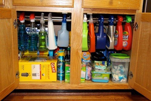 Разнообразные бутылки с чистящими средствами стоит организовать по категориям, разместив их в отдельных контейнерах и подписав. Игнорирование этого простого совета может привести к беспорядку на полках и затруднениям в поиске нужного продукта.