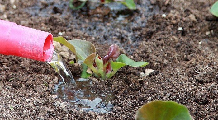 До появления первых всходов полив следует проводить с использованием пульверизатора, чтобы не сместить семена. Однако после того, как ростки прорастут, обрызгивание становится нежелательным, так как капли воды на листьях могут привести к солнечным ожогам. В этом случае ростки лучше поливать из лейки теплой отстоянной водой.