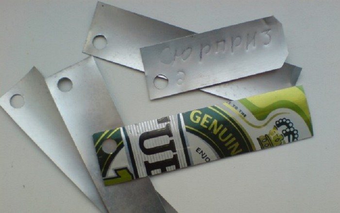 Бирки изготавливаются из алюминиевых банок, которые использовались для пива, коктейлей и других напитков. Их нарезают на тонкие полоски, после чего необходимую информацию можно выцарапать с помощью гвоздя или другого острого предмета, либо записать маркером. Такие жестяные бирки отличаются высокой прочностью и сохраняют свой первоначальный вид даже при использовании на улице.