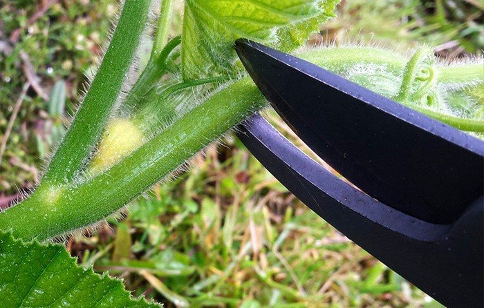 Для сортов, дающих мелкие плоды, условия несколько отличаются. Над каждой оставленной завязью достаточно оставить 2-3 листа. Если сорт не известен, рекомендуется выбрать промежуточный вариант и оставить 4 листа. Это гарантирует, что тыквины вызреют в любом случае. Прищипку побегов можно выполнять вручную, однако лучше воспользоваться секатором или ножницами, чтобы срез был аккуратным и быстро зажил.