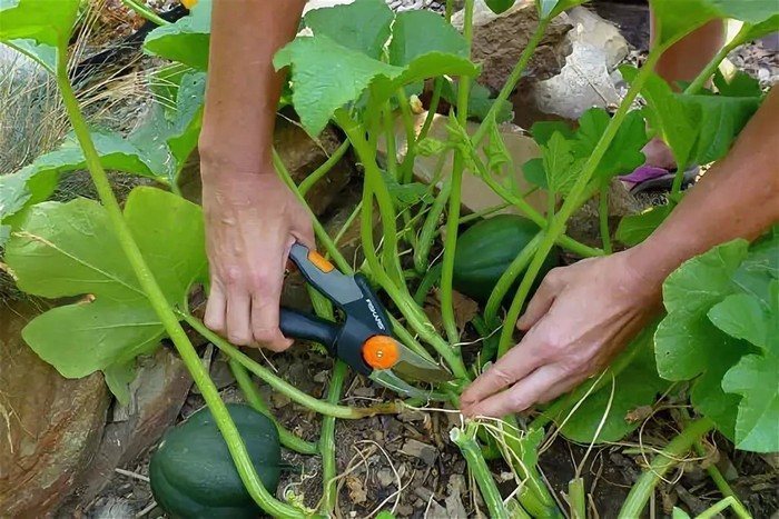 Куст необходимо очищать не только от лишней зелени, но и контролировать количество завязей. Если не уделить этому внимание, тыквы могут не успеть созреть до наступления холодов, и дачник останется без урожая.