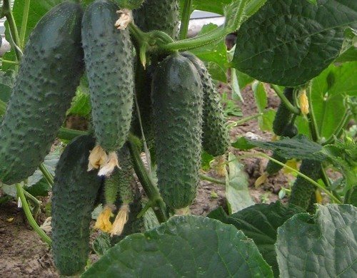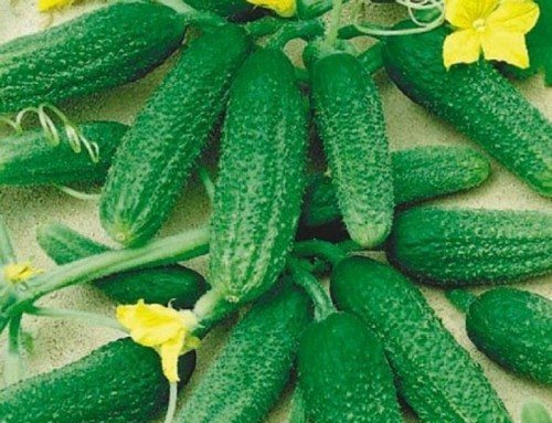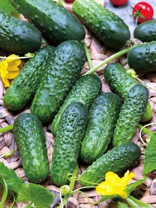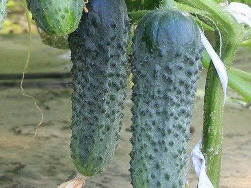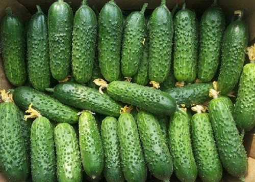 Каждый огурец достигает длины 13-15 см и весит около 115-130 г. На зеленой кожуре расположены густые бугорки с белыми пупырышками. Каждое пучковое соцветие образует примерно 10 завязей, что позволяет собирать с одного куста 6-7 кг огурцов.