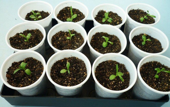 Первый раз сеянцы пересаживают в стаканчики объемом 200 мл или в кассеты, когда на них появится по два настоящих листа. Грунт должен быть таким же, как и при посеве. В конце марта гвоздику пикируют во второй раз, используя новые емкости диаметром 10–12 см.