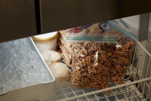Орехи также можно хранить в морозильной камере. Низкая температура способствует продлению их срока годности. Ядра следует поместить в сухой вакуумный пакет или другой подходящий контейнер. При таком способе хранения они могут оставаться свежими от 1 до 3 лет.