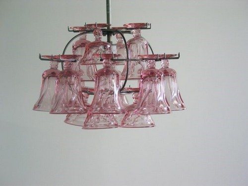 Чтобы большая креманка или салатница не пылилась, а приносила пользу, ее можно превратить в оригинальную люстру. Для этого достаточно установить патрон с лампочкой и дополнить конструкцию необходимыми элементами. Рельефные стенки посуды создадут эффект изысканных кружевных узоров на стенах помещения. Вы можете использовать как один крупный предмет, так и несколько маленьких рюмок.