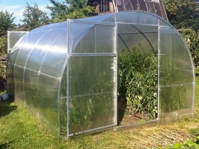 Теплица представляет собой достаточно прочное сооружение. Ее высота составляет примерно 2,5 метра и более, что позволяет человеку свободно передвигаться внутри. Существуют также конструкции больших размеров, которые позволяют без проблем проезжать внутри сельскохозяйственной техники. Однако такие варианты больше подходят для тепличных комплексов, чем для небольших дачных участков.