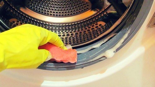 - Обязательно наденьте защитные перчатки и с помощью губки нанесите раствор на участки, пораженные плесенью (барабан, манжета, контейнер для порошка).