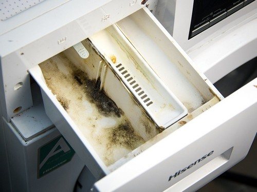 - Применение кондиционера без дополнительного полоскания – ополаскиватель делает ткани мягче, но требует более длительного цикла стирки. Остатки смягчителя на стенках машины образуют сизый налет, который создает идеальные условия для роста грибка.