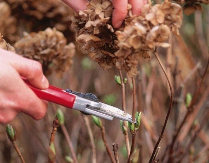 Взрослую гортензию обрезают осенью ежегодно. Это делают после того, как опадут листья в саду, а пышные ароматные шапки соцветий превратятся в коричневый гербарий. Эта процедура большей частью санитарная и проводится независимо от того, укрывают куст на зиму или нет.