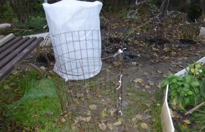 Перед началом укрытия ветви кустарника связывают шпагатом. Затем куст оборачивают плотным спанбондом в два слоя и фиксируют укрывной материал веревкой. После этого вокруг куста устанавливают каркас из сетки и заполняют его сухими листьями.