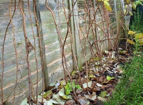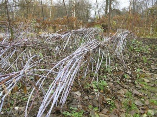 Процесс осуществляется сразу после того, как листья опадут. Чтобы пригнуть ветви, можно использовать простую конструкцию. Для этого нужно вбить деревянные столбики рядом с посадками и натянуть между ними проволоку на высоте 20 см от земли. Чем ближе будут находиться побеги к земле, тем быстрее они окажутся под снегом и избежат заморозков. Для подвязывания рекомендуется использовать капроновые нити.