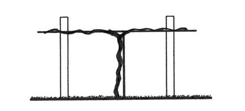 Иногда молодой куст может достигнуть верхнего троса (150 см) всего за год. В таком случае необходимо обрезать верхушку отростка на верхней проволоке, после чего боковые побеги начнут расти горизонтально в обе стороны. Эти побеги будут использованы для формирования новых кордонов. Обрезка однолетних лиственных побегов должна быть минимальной, однако может потребоваться небольшая корректировка, чтобы помочь в формировании виноградной лозы перед началом второго года роста.