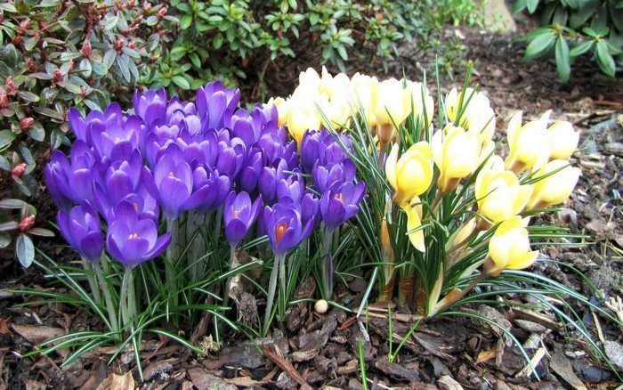 Цветы предпочитают питательную почву. Перед посадкой рекомендуется удобрить землю перегноем, древесной золой, суперфосфатом и калийной солью. На дно лунок стоит положить немного песка. Для высадки выбирайте луковицы диаметром не менее 3 см. Глубина посадки крокусов составляет 8-12 см, в зависимости от типа почвы. После того как луковицы окажутся в земле, поверхность следует мульчировать торфом, древесной щепой или корой.