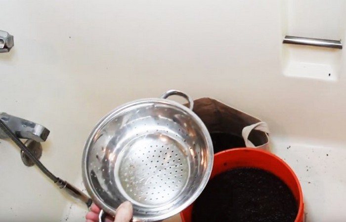 Для подготовки эффективной смеси для рассады брикеты или маты необходимо сначала промыть горячей проточной водой или кипятком. Для этого потребуется контейнер с отверстиями для стока лишней влаги, сито или капроновый мешок. После тщательной обработки (5–6 раз) излишки жидкости должны полностью стечь.