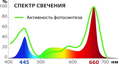 Сине-красное свечение (SPSB спектр). Для правильного развития рассады или черенков наиболее важны красные и синие пики в спектре. Они помогают вырастить крепкую рассаду, которая со временем превратится в здоровое растение. Так, синий свет ускоряет синтез белка, стимулирует рост зеленой массы и развитие новых побегов.